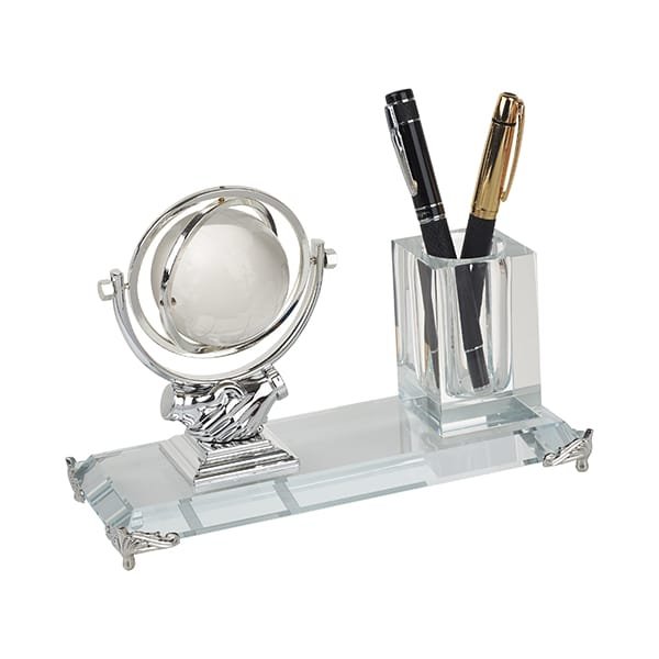 מעמד קריסטל בעיצוב גלובוס הממוקם על בסיס של לחיצת יד, כולל כוס לעטים. המעמד מספק עיצוב ייחודי ופונקציונליות גבוהה. גובה המעמד: 22 ס"מ, רוחב: 15 ס"מ, עומק: 12 ס"מ.